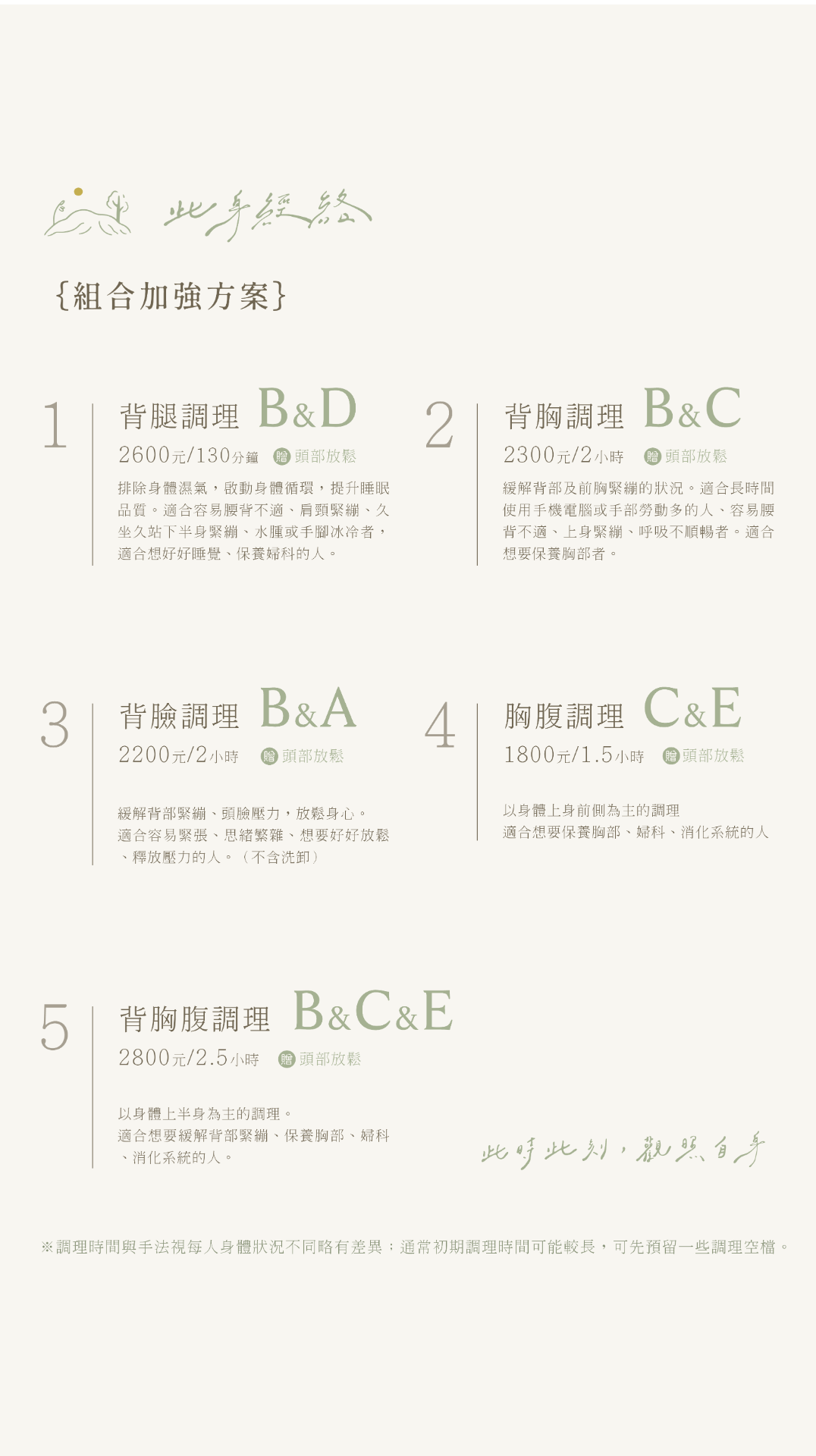 - 適合容易腰背不適、肩頸緊繃、久坐久站下半身緊繃、水腫或手腳冰冷者。